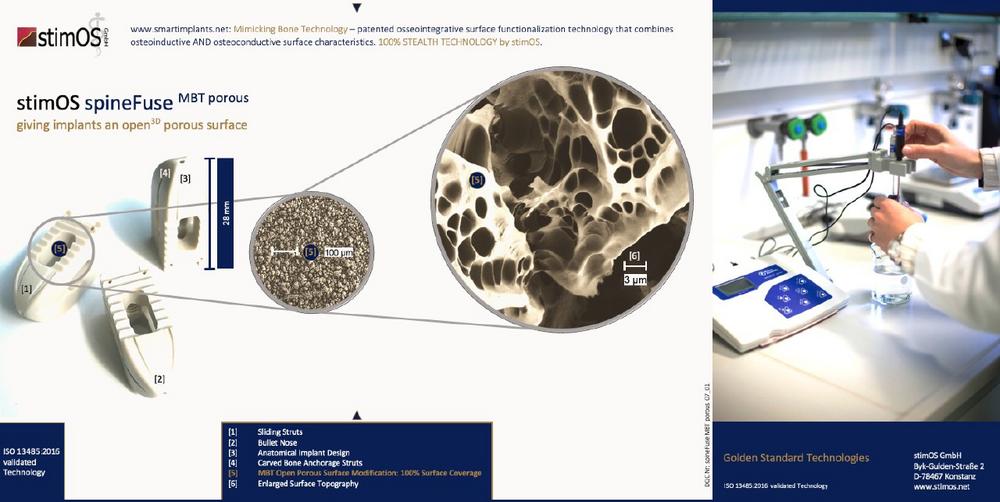stimOS GmbH, a privately held research-company and 13485:2016 certified legal manufacturer, was founded in 2015. stimOS develops innovative technologies and procedures to refine, functionalize and activate implant materials. As a supplier and service provider, stimOS makes this technology available to implant manufacturers. In addition, the company also offers services in the field of product development and certification and develops with the product line spineFuseMBT implants for spinal fusion surgery.