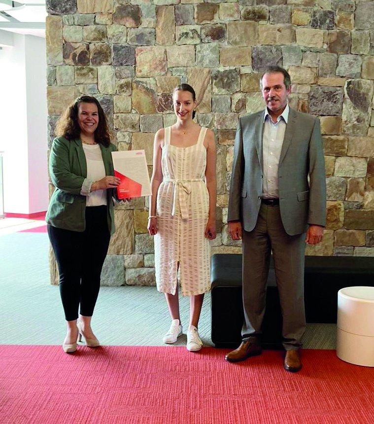 The SEMIKRON Bachelor Women Award was presented for the first time at this year’s Day of Electrical Engineering, Electronics and Information Technology (“EEI Day”) at the Friedrich-Alexander University Erlangen-Nürnberg (FAU). The lucky award winner, student Katharina Stich, received the prize in recognition of the excellent mark awarded for her BA dissertation. Professor Uwe Scheuermann, Simulation & Analysis Director at SEMIKRON, and Anja Oberndörfer, Head of Training at SEMIKRON, handed over the award during a virtual ceremony held on 16 July 2021. At a later meeting in person at SEMIKRON’s head office in Nuremberg, the award winner was presented with the award certificate and a cheque for 750 euros. Bernd Enser, Chief Operating Officer (COO) at SEMIKRON, congratulated Ms. Stich on the award while Ms. Oberndörfer spoke of the importance of promoting young women who are on MINT study programmes. SEMIKRON will continue to support Ms. Stich as part of a mentoring programme where, among other things, she will have the opportunity to experience first-hand what a day in the life of a female engineer is like.