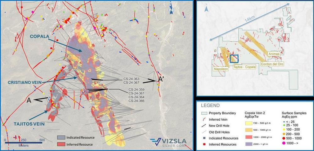 The precious metals dominant Copala structure, located in the western portion of the Panuco district, is situated ~800 m to the east of the Napoleon Vein. Copala currently hosts Indicated Resources of 83.3 Moz AgEq at 573 g/t AgEq and Inferred Resources of 48.3 Moz AgEq at 476 g/t AgEq within a broad envelope of vein-breccia interlayered with host rock, up to 82 metres thick (please refer to our Technical Report on Updated Mineral Resource Estimate for the Panuco Ag-Au-Pb-Zn Project, Sinaloa State, Mexico, by Allan Armitage, Ben Eggers and Peter Mehrfert, dated February 12, 2024 and to Vizsla’s press release dated January 8, 2024). Interpretations by Vizsla geologists indicate Copala has an average dip of ~46° to the east (~35° in its northern sector and steepening to ~65° in the southern sector).