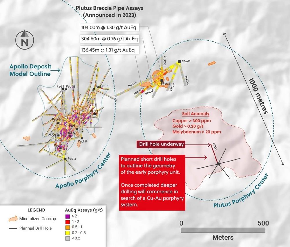 - The Plutus Target, which lies approximately 1,000 metres east of Apollo, measures 1,000 metres by 750 metres in area and remains open in all directions. Two targets have been outlined thus far at Plutus, an untested copper-gold porphyry target in the south and a breccia pipe target in the northwest. Prior assay results from drilling in 2023 into the breccia pipe target in the northwest yielded multiple broad intercepts including 45 metres @ 1.31 g/t AuEq (see press release dated October 11, 2023).