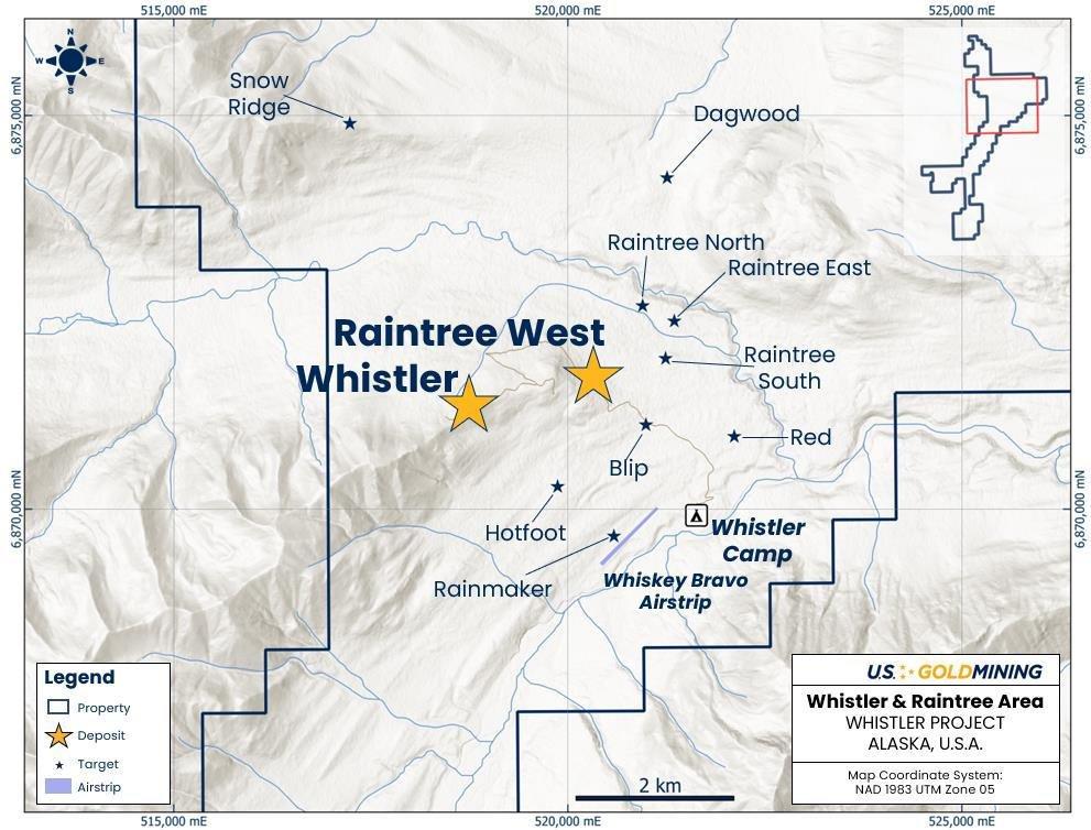 Tim Smith, Chief Executive Officer of U.S. GoldMining, commented: "The 2023 drill program returned the longest drill intercept of consistent mineralization ever recorded at the Project: 547.2 meters at 1.06 g/t AuEq in WH23-03. We are further encouraged that we have now extended this by an additional +100 meters to enlarge the continuously mineralized intercept within the Whistler deposit high-grade core to 652.5 meters at 1.00 g/t AuEq. At Raintree, the drilling has returned both porphyry and vein-type mineralization, which both remain open along strike and to depth, warranting additional follow-up exploration. I want to acknowledge our professional and hard-working field teams that executed the 2024 exploration program safely, without a single lost time incident to date, and delivered on budget and ahead of schedule.”