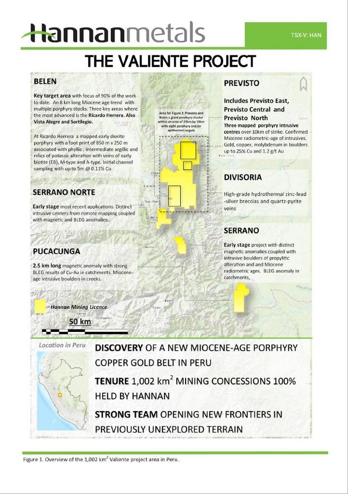 The 100% owned Valiente project is in central eastern Peru, east of the city of Tingo Maria (Figures 1 and 2). The area is characterized by steep topography on the eastern flank of the Central Cordillera with elevations between 800 m and 2,000 m above sea level (a.s.l.). The project was discovered in 2021 during an extensive greenfields mineral prospecting program initiated by Hannan for back-arc porphyry copper-gold systems. The Company has been actively exploring the project since 2021 and has successfully gained social permits progressively in all areas of interest.
