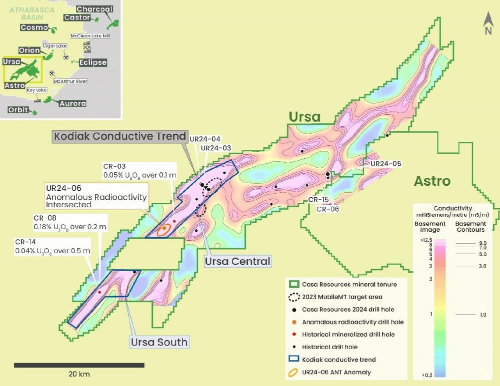 Keith Bodnarchuk, President and CEO, commented: “With only the second drill program on a Project that captures over 65 kilometres of underexplored conductive strike length we have significantly upgraded the Kodiak trend and the Ursa Project as a whole. Intersecting eastern Athabasca unconformity style sandstone alteration underlain by multiple zones of basement hosted radioactivity in drill hole UR24-06 is a significant achievement for our technical team and is a compelling demonstration of the prospectivity of the Cable Bay Shear Zone. The intensely graphitic basement conductor intersected by UR24-04, approximately 9 kilometres northeast of UR24-06 and on the Kodiak trend, suggests that significant structural disruption and hydrothermal alteration typical of the unconformity model may continue for many kilometres on the Project. Modern geophysical coverage has proven to be a worthwhile investment at Ursa, and we have never been more excited to return for follow-up drilling in the vicinity of these results and to continue evaluating additional kilometre-scale ANT anomalies.”