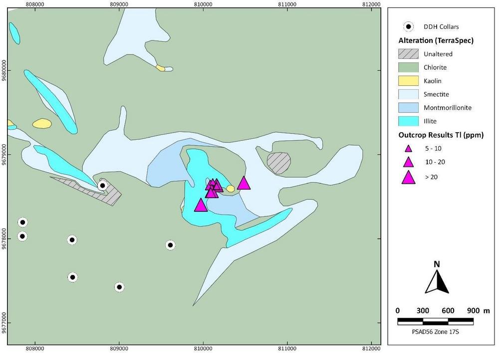 Kuri-Yawi is the most advanced epithermal target in the Company’s Cutucu project. The discovery of numerous sinters by the Aurania team in 2018 highlighted the area as highly prospective for epithermal gold mineralization. Extensive fieldwork subsequently conducted in the area, including geology, soil geochemistry and a Mobile MagnetoTellurics (MobileMT) airborne survey led to the drilling of nine scout holes during 2020 and 2021 to investigate the soil anomalies at depth. The results of the program indicated a vector to mineralization toward the northeast, the subject area of the current IP survey. Subsequent prospecting in this area discovered thallium-rich chalcedony veins (see Figure 1). Importantly, thallium is a volatile element often present in the upper parts of epithermal deposits. As well, TerraSpec infrared analyses of the alteration minerals in this area show typical epithermal chlorite-smectite-illite zonation towards the vein zone. The presence of these minerals suggests an intense hydrothermal alteration in the center of an epithermal system, which is interpreted to be responsible for the demagnetization of rocks observed in the area and also shown on the 2017 magnetic airborne survey (see Figure 2).
