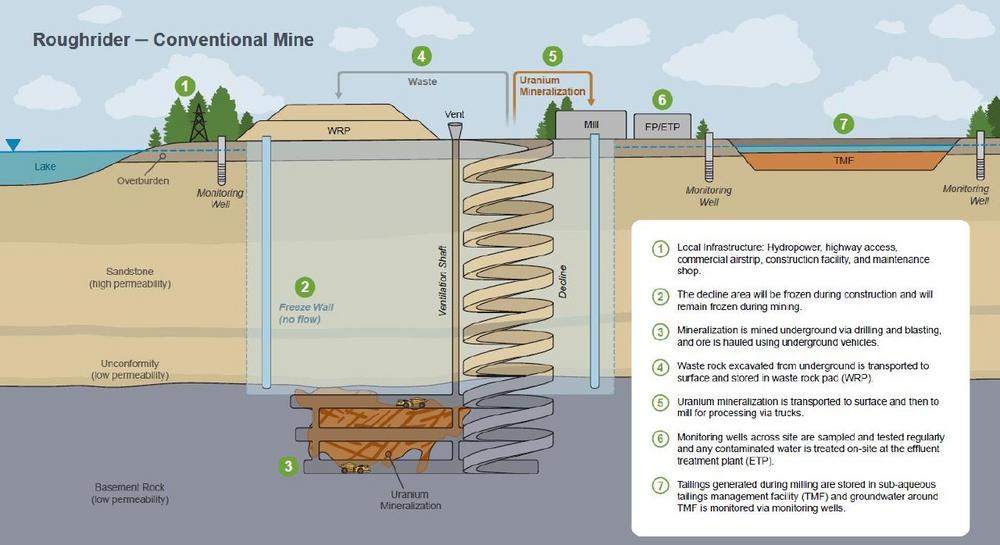Ground freezing will be used to control water inflows into the main decline to a depth below the unconformity as well as into the three mining zones.  Freeze wells will be installed from surface around the perimeter of each zone with active freezing starting at least 12 months prior to mining.  Figure 1 was generated by UEC as a conceptual image of the conventional underground mine. Further details of proposed mining and milling methods are set out in the Technical Report Summary.