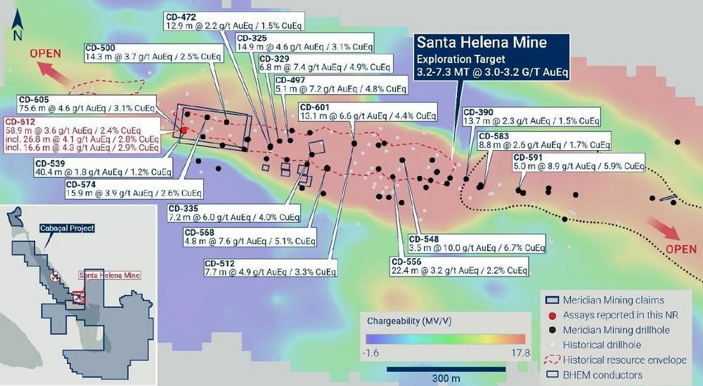 Meridian Mining UK. S (TSX: MNO), (Frankfurt/Tradegate: 2MM) (OTCQX: MRRDF) (“Meridian” or the “Company”) – https://www.commodity-tv.com/ondemand/companies/profil/meridian-mining-uk-societas/ – is pleased to provide a drilling update for the Santa Helena Cu-Au-Ag & Zn deposit (“Santa Helena”). CD-612 has drilled another lateral extension, assaying 58.9m @ 3.6g/t AuEq* (2.8g/t Au, 0.7% Cu, 19.0g/t Ag & 1.7% Zn), including a higher-grade zone of 26.8m @ 4.1g/t AuEq (4.2g/t Au, 0.7% Cu, 13.1g/t Ag & 0.8% Zn), in the western gold domain of the Santa Helena deposit (“Figure 1”, “Figure 2”). This result extends the localized across strike thickness of CD-605’s[1] 75.6m @ 4.6g/t AuEq (3.0g/t Au, 1.0% Cu, 30.2 g/t Ag & 2.5% Zn). Drilling is continuing with further assays pending.