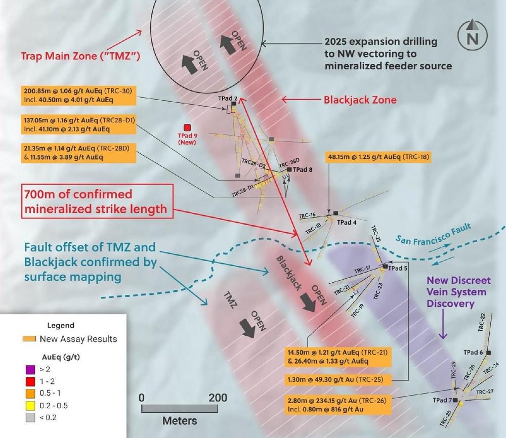 Ari Sussman, Executive Chairman commented: “Trap continues to demonstrate that there is a lot of metal in the system including the discovery of a new high-grade gold-rich vein system. Detailed analysis of Trap suggests that both the TMZ and Blackjack zones should be drilled along strike to the northwest in 2025 as drilling strongly suggests that the metal bearing fluids intensify in this direction and could be pointing towards a mineralized porphyry feeder system. Drilling has just resumed, and we look forward to expanding Trap this year.”