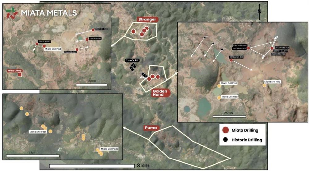 “We have completed the first 10 holes totalling approximately 1,500m, or 15%, of our targeted of 10,000 meters this year, and the drill crew continues to increase their average daily production.” stated Dr. Jaap Verbaas, CEO of Miata. “Assays are pending QAQC checks for several holes and will be disseminated once the Company has verified current assaying protocols and methods. The drill is currently testing the Golden Hand target where a large amount of small-scale saprolite mining has taken place in the past.”