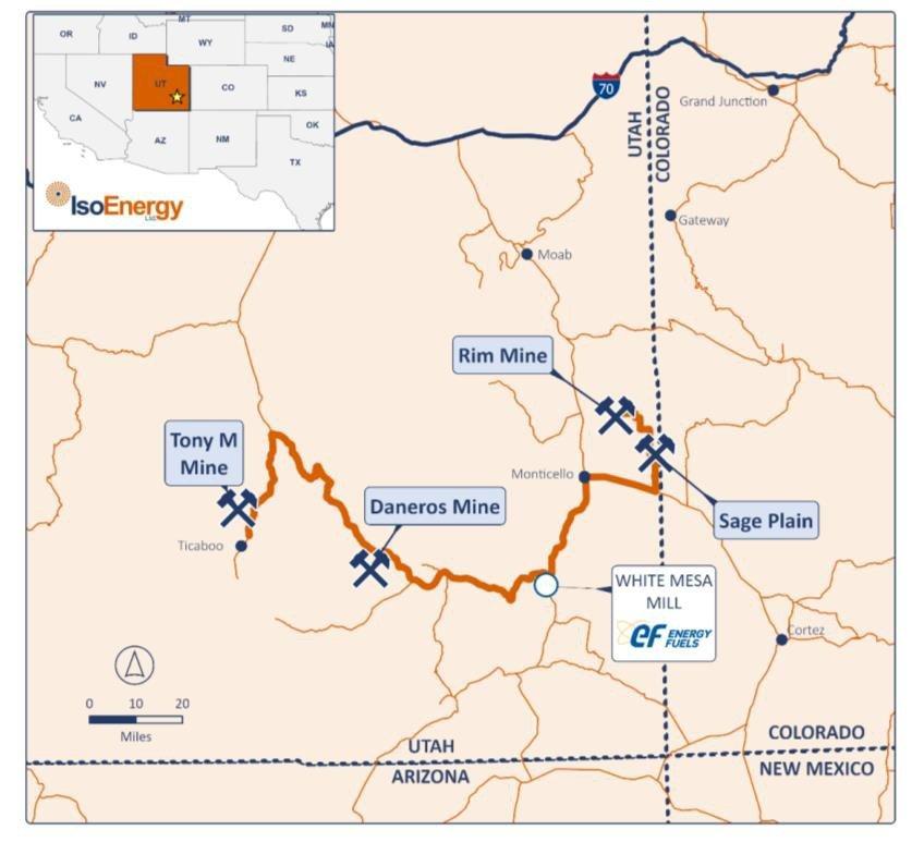 Figure 1: Location of IsoEnergy’s three past-producing mines in Utah, strategically positioned near the fully operational White Mesa Mill, where IsoEnergy holds a toll milling agreement with Energy Fuels. White Mesa is the only fully licensed and operating conventional uranium mill in the United States, with a licensed capacity of over 8 million pounds of U₃O₈ per year, playing a vital role in the U.S. nuclear fuel supply chain.