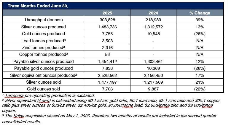 "We delivered strong and consistent production in the second quarter,” said Dan Dickson, Chief Executive Officer of Endeavour Silver. “The integration of Kolpa is progressing smoothly, with output already trending above initial expectations. At the same time, Terronera continues to move steadily toward commercial production. This is a pivotal time for Endeavour as we build operational momentum and position the Company for meaningful, long-term growth."