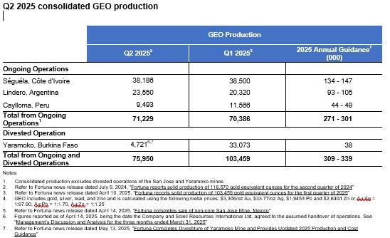 Consolidated GEO production for the first six months of 2025, including the Yaramoko Mine, totaled 179,409 ounces, inclusive of lead and zinc by-product credits. Fortuna reiterates its updated annual production guidance for 2025 in the range of 309,000 to 339,000 GEO. All figures presented in this news release are expressed in U.S. dollars unless otherwise indicated.