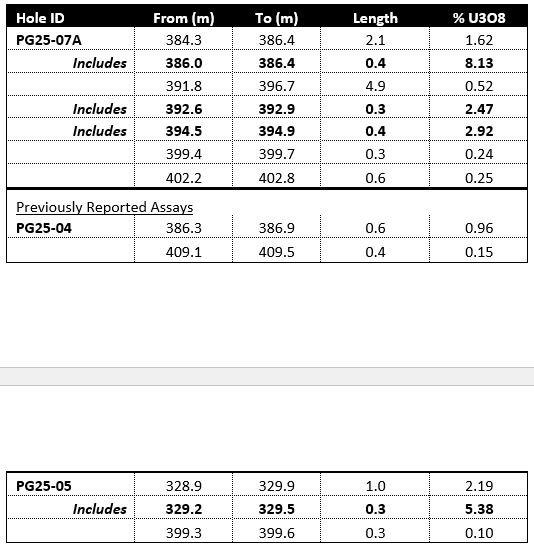 - Select samples from PG25-07A were fast-tracked for assay to confirm uranium grades and mineral composition. Full assays from all holes remain pending.