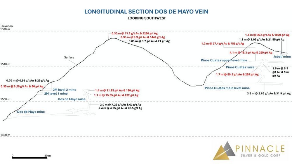 Oberhalb der Dos de Mayo Mine wird die zuvor bekanntgegebene (2. Juni 2025) Probe mit 13,2 g/t Au und 2.280 g/t Ag über 0,30 Meter durch eine neue Grabprobe ergänzt, die 9,9 g/t Au und 1.444 g/t Ag über 0,35 Meter ergab. Diese und andere Proben erweitern die Mineralisierung effektiv von einer Höhe von 1490 m ü. M. (Meter über dem Meeresspiegel) auf 1570 m ü. M., was einer vertikalen Entfernung von 80 Metern entspricht (siehe Längsschnitt unten). Oberhalb der Pinos Cuates Mine ergaben Oberflächenkanalproben bis zu 37,4 g/t Au und 755 g/t Ag über 1,2 Meter, während Probenahmen in einem kleinen Untertagebau namens El Jabali bis zu 36,4 g/t Au und 1.029 g/t Ag über 1,4 Meter, was zusammen eine vertikale Entfernung von 45 Metern von 1.520 m ü. M. bis 1.565 m ü. M. definiert. Zwischen den Dos de Mayo und Pinos Cuates Minen befindet sich eine unerforschte Lücke von etwa 120 Metern, in der es keine Aufschlüsse oder Untertagebauten gibt, aber die beiden Minen definieren eine Streichlänge von etwa 325 Metern.