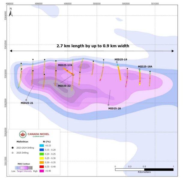 The Midlothian property is directly accessible by road all year round. Midlothian is a joint-venture between Canada Nickel and Canadian Gold Miner Corp. and Laurion Mineral Exploration Inc. and is in the final year of a four year agreement where Canada Nickel needs to make a final payment of $400,000 and issue 140,000 shares to earn a 100% interest in the property.  Six infill drillholes were completed during the summer of 2025. All six holes intersected long largely continuous intervals of mineralized dunite with the two holes collared on top of the mineralization intersecting it at shallow depths less than seven metres (Figure 1). These holes were drilled on a geophysical target measuring 2.7 kilometres long and 0.4 to 0.9 kilometres wide with a target footprint of 1.7 km2 (compared to Crawford target footprint  of 1.5 km2). This release contains assay information on three completed holes. Assays are still pending on the three remaining drillholes. With the combined dataset (2023,2024, 2025 drilling), the Company intends to produce an initial resource estimate at Midlothian by year end 2025.