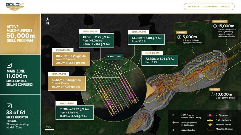 Michael Henrichsen, CEO of Gold X2 commented, "Our latest drill results continue to demonstrate excellent continuity of mineralization at the Moss Main zone. These results validate our geological model that will be utilized in our upcoming Mineral Resource Estimate to be released in conjunction with the PEA. In addition, the results from grade control drilling will help define the spacing for the infill drill program as we look toward advancing the Moss Deposit toward a future feasibility study.”