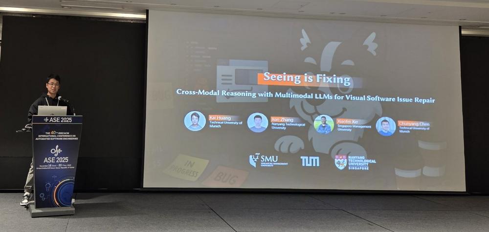 Kai Huang, a doctoral student at Professor Chunyang Chen’s Chair of Software Engineering & AI at TUM Campus Heilbronn, received the ACM SIGSOFT Distinguished Paper Award at this year’s Conference on Automated Software Engineering (ASE 2025) in the South Korean capital Seoul for his approach to using visual information for optimization. The title of his scientific publication is: ”GUIRepair – Seeing is Fixing: Cross-Modal Reasoning with Multimodal LLMs for Visual Software Issue Repair”.
