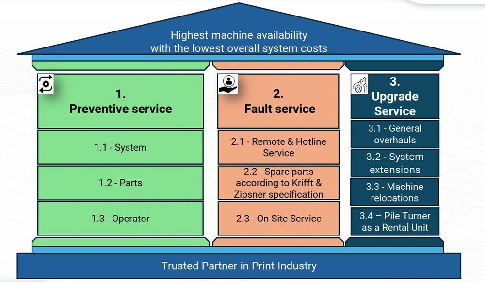 With a newly structured and holistic service plan, Krifft & Zipsner GmbH strengthens its role as a reliable partner of the international printing and finishing industry. Under the guiding principle "We move with system!", the company bundles its services in a clear organisational structure and focuses on maximum machine availability while keeping overall system costs to a minimum.
