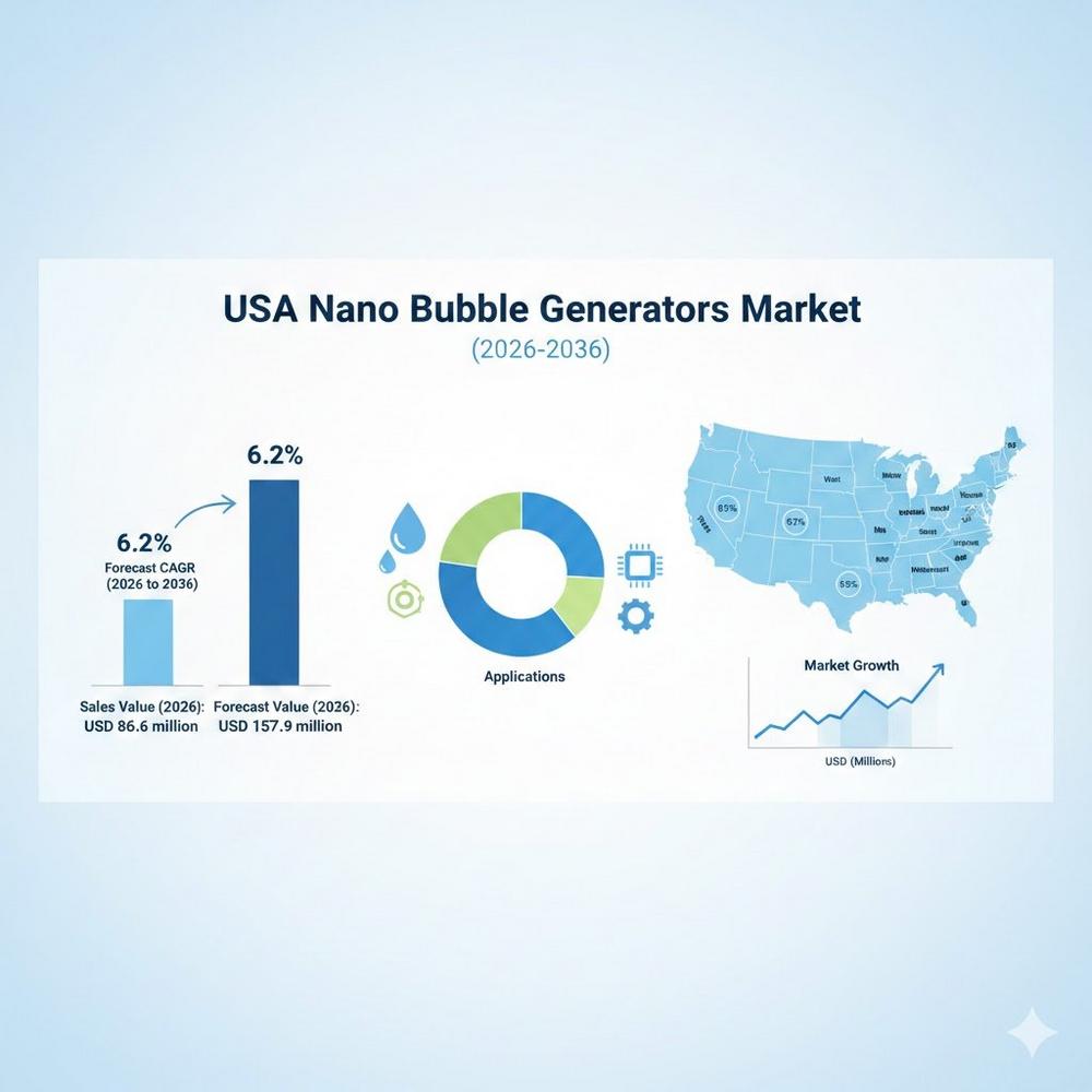 The Demand for nano bubble generators in the USA is valued at USD 86.6 million in 2026 and is projected to reach USD 157.9 million by 2036, expanding at a 6.2% CAGR over the period. Growth is anchored in the need to improve water and process efficiency without proportionally increasing energy or chemical inputs.